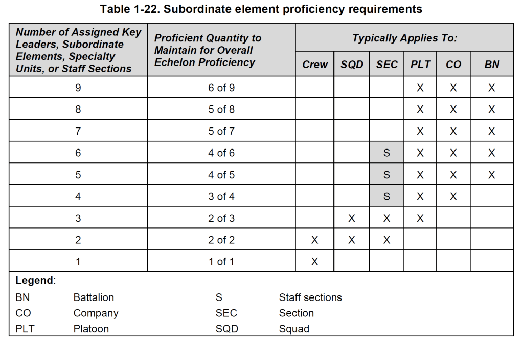 For large units with subordinate elements, the proficiency standards change somewhat: