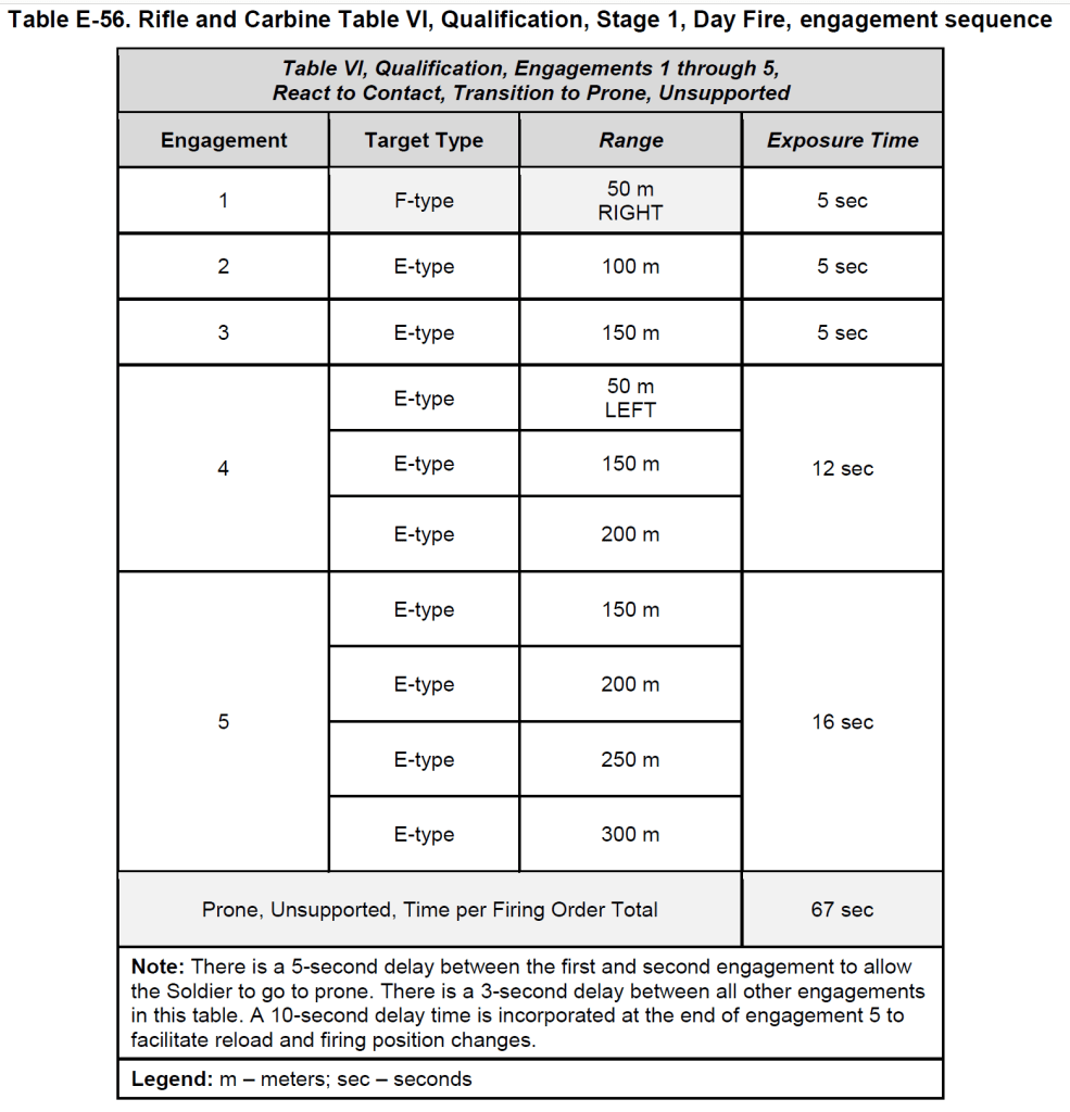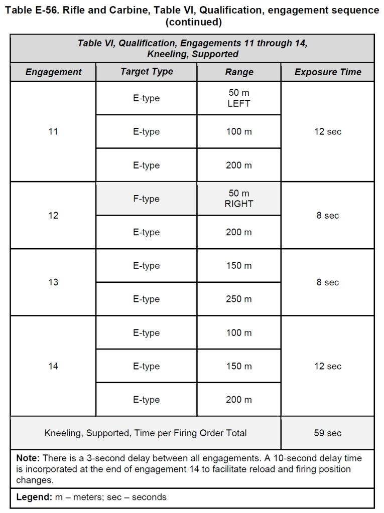 As with table V, there should be a three second delay between each engagement. After each phase (ie, prone unsupported to prone supported) there should be a ten second transition delay to allow the shooter time to reload and assume the next position. The following tables show the engagement sequence by target type.