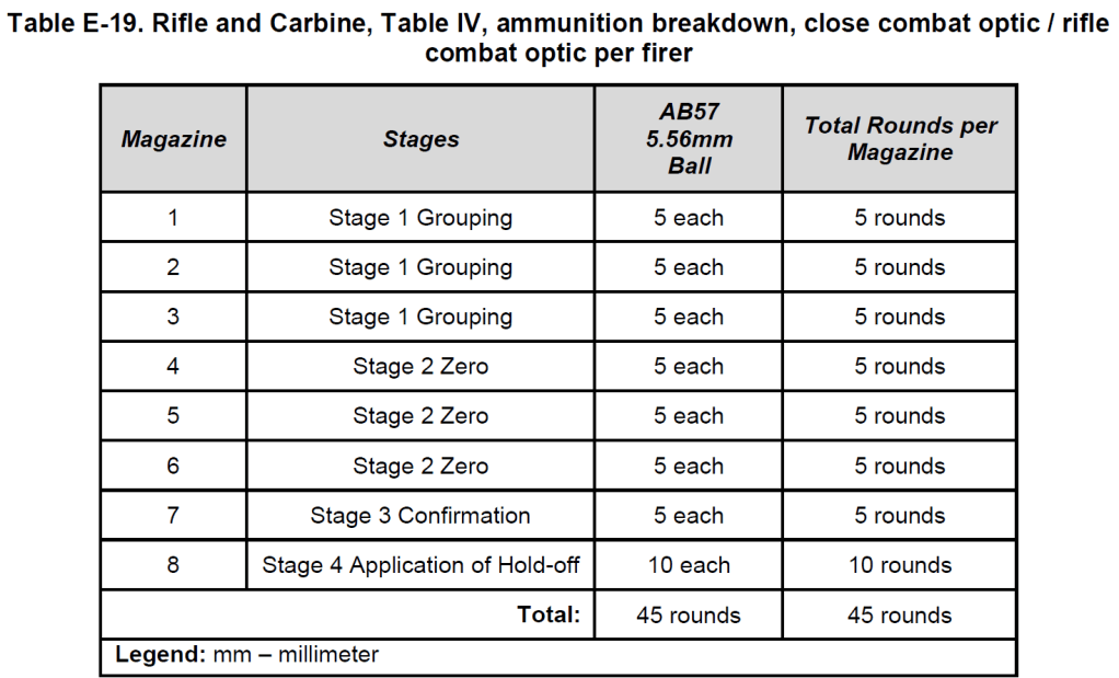 Notice that the table indicates a shooter group first, then move on to zeroing. The table also indicates that shooters use five-round shot groups. This is important, as it allows a shooter to better understand their grouping. A three round group often includes a ‘stray’ round – the shooter shifted slightly, or breathed a bit differently – that doesn’t accurately portray the shooter’s group. For this reason, a five-round group is recommended.