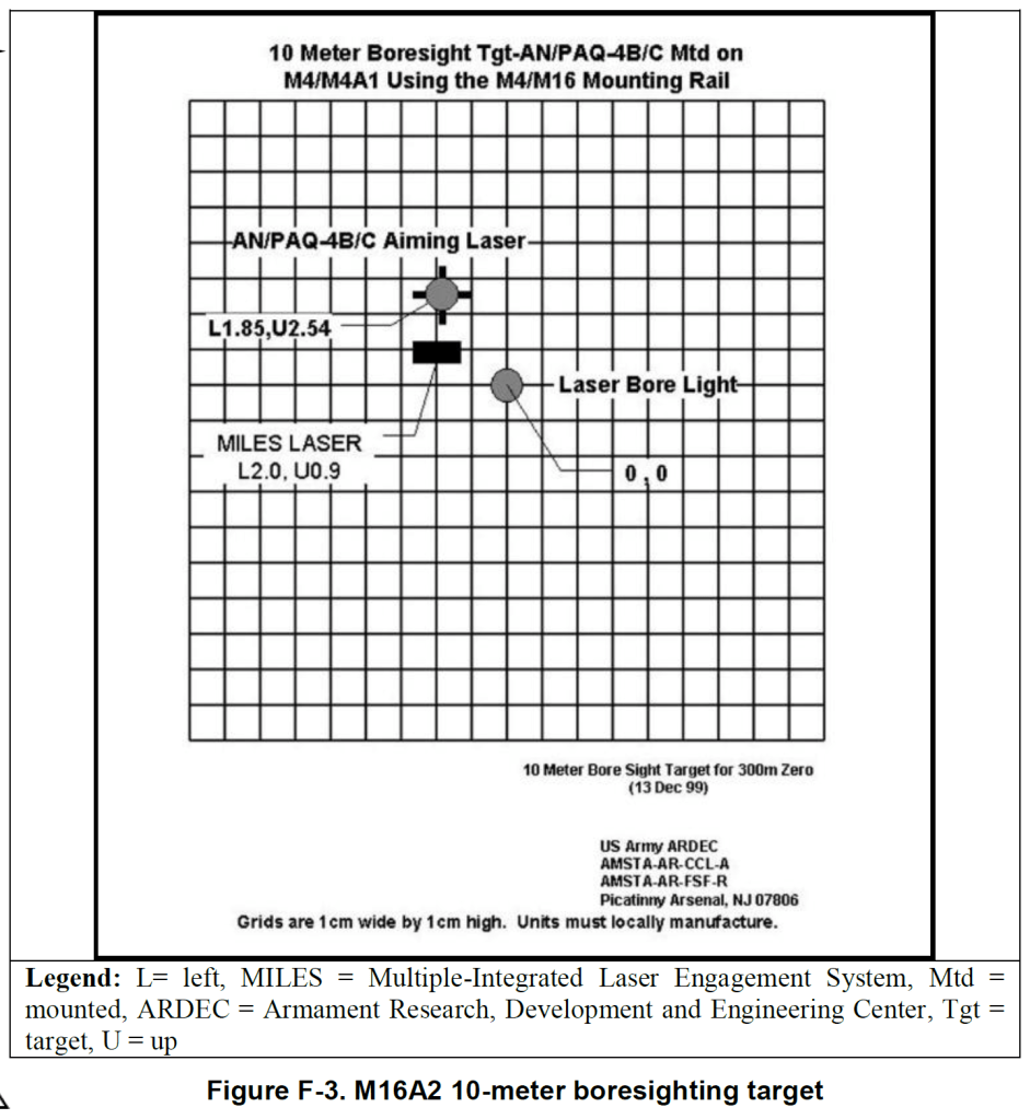 Prior to zeroing on the range, Soldiers with the equipment should laser borelight their weapons. The particular brand of borelight will come with instructions, however there’s a link to a great write up on how to boresight a weapon here. Additionally, the TC mentioned in the previous paragraph goes into great detail on this process in appendix F. The graphic below shows what a boresight target looks like.